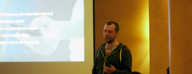 Johannes Baeck,  User Experience Designer bei usability.de, griff in seinem Impulsvortrag das Thema Prototyping auf: „Welchen Mehrwert bietet uns die Arbeit mit ganz unterschiedlichen Prototypen vor allem in Hinblick auf einen geräteübergreifenden Entwicklungsprozess?“ Johannes griff dabei unter anderem die Idee von Scott Klemmer auf, Prototypen als ein Frageinstrument zu verstehen. Egal ob erste Papierskizzen oder ein in Funktion und visueller Ausgestaltung bereits sehr detaillierter Prototyp: Es entsteht durch Prototyping immer eine unaufwendige Möglichkeit, schon sehr früh wichtige Fragen an Projektbeteiligte und Nutzer stellen zu können, so zum Beispiel: „Funktioniert der Ansatz, den wir uns hier überlegt haben, wirklich geräteübergreifend?“, oder „Wie fühlt Sich diese Idee für Sie als Nutzer an?“ Im Vortrag stellte Johannes außerdem verschiedene Formen von Prototypen vor und demonstrierte einige Tools, die insbesondere für die geräteübergreifende Konzeption vielversprechend wirken.