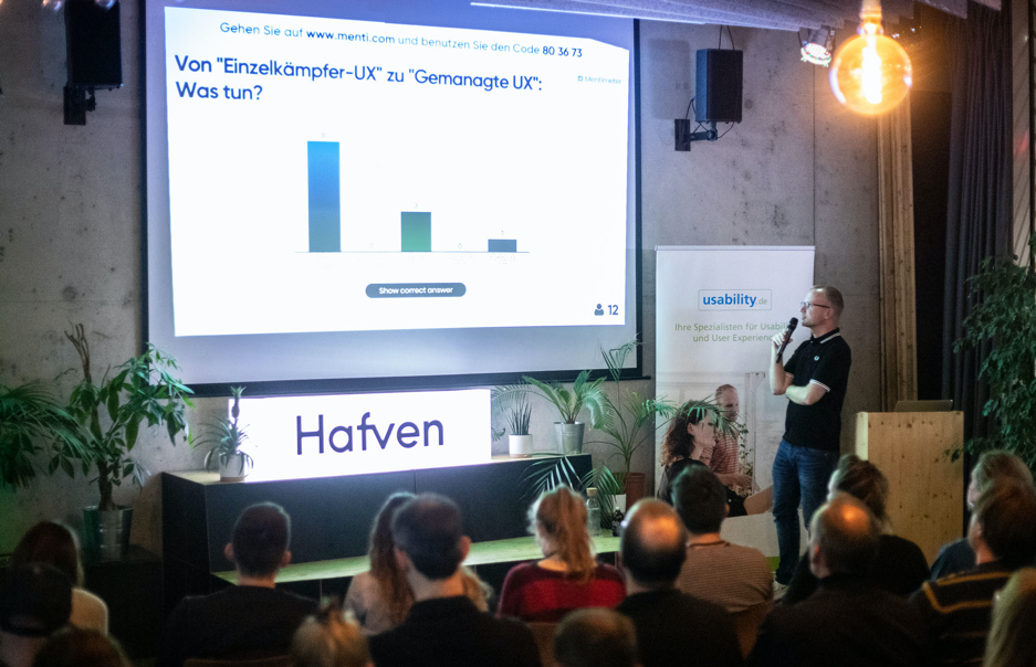 Jede Stufe hat ihre eigenen Herausforderungen und Schwierigkeiten, für die passende Lösungen gefunden werden müssen. Im Anschluss sollten sich die Zuhörer in einer Live-Abstimmung selbst in eine der Stufen einordnen und es zeigte sich, dass sich der Großteil im mittleren Bereich bewegt. Meist gibt es bereits erste Bestrebungen in Sachen UX, der Weg bis zur vollen Integration von Usability und UX in die Unternehmensstrategie ist anscheinend noch sehr weit. Aber: Kulturwandel braucht Zeit. Entscheidend ist es, die richtigen Methoden und Wege zu finden, um das Thema im Unternehmen voran zu bringen. An dieser Stelle auch ein Hinweis auf das Buch: „UX Management – So verankern Sie Usability und User Experience im Unternehmen„.
