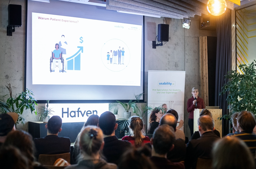 Zum Thema Health & Wellbeing berichtete Jana Rockstroh von usability.de von einem gemeinsam Projekt mit Siemens Healthineers. Dabei ging es darum, das Erleben von Patienten, die ein bildgebendes diagnostisches Verfahren durchlaufen, z.B. ein MRT, ganzheitlich zu erheben und Problemstellen aufzudecken.